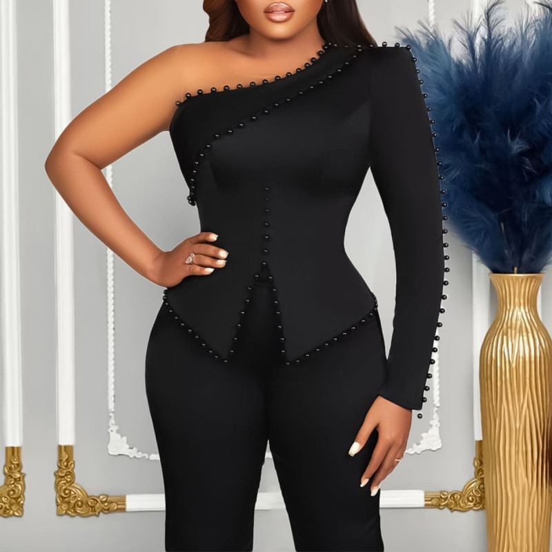 Diagonal Shoulder Studded Top OL Tongle Women Clothing 2PCS